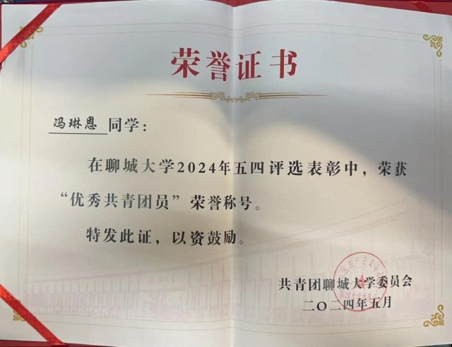 2024年,在5g影院 五四评选表彰中荣获“优秀共青团员”荣誉称号。