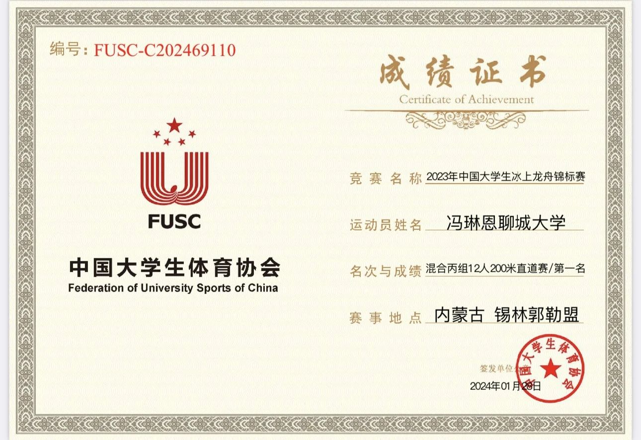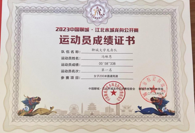 2023年,在山东省第十二届全民健身运动会龙舟比赛授予“志愿者”证书;