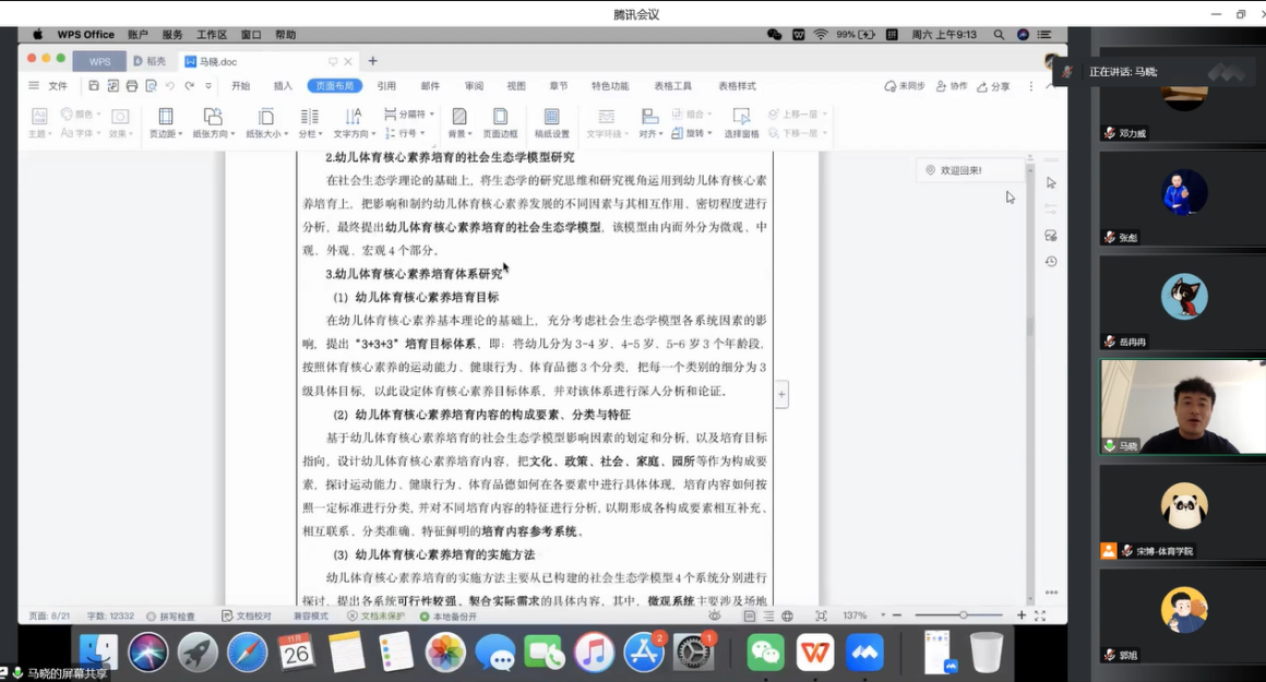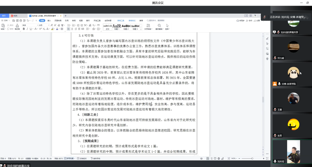 11月26日,5g影院 线上开展了学术团队课题研讨活动,本次学术活动分别由“运动员核心竞技能力评价与促进团队”的马晓老师和“民族传统体育文化弘扬与传承团队”的刘庆闯老师进行了省社科课题申报书的汇报。马晓作了题为《基于社会生态学模型的幼儿体育核心素养培育体系研究》的报告,刘庆闯作了题为《体教融合背景下山东省陆地冰壶可持续发展路径研究》的报告。本次研讨会由科研秘书宋博主持。