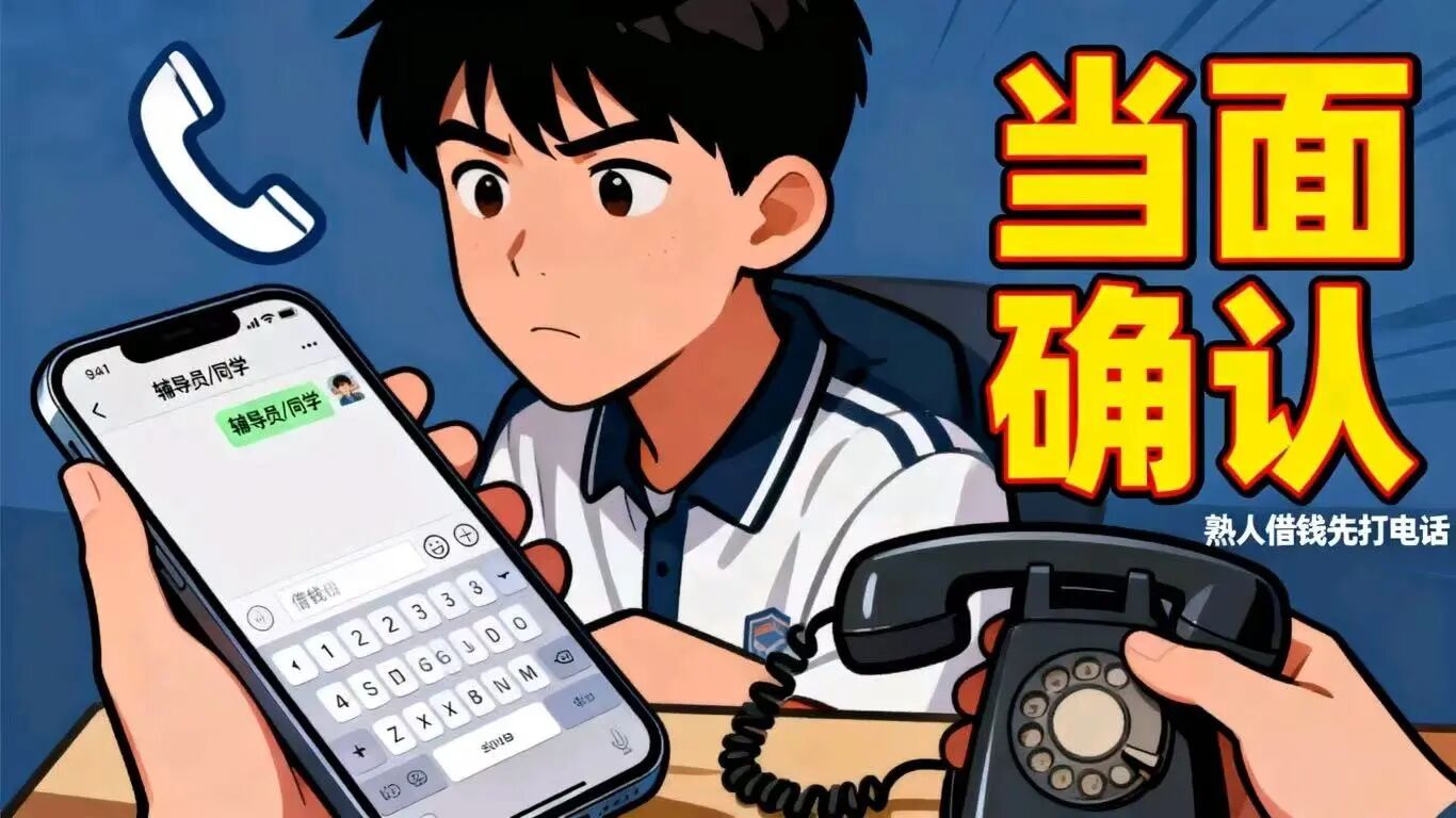 4.“熟人借钱”先打电话:接到“辅导员/同学”借钱的微信、QQ消息,别急着转账,先通过电话或当面确认,避免被冒名诈骗。