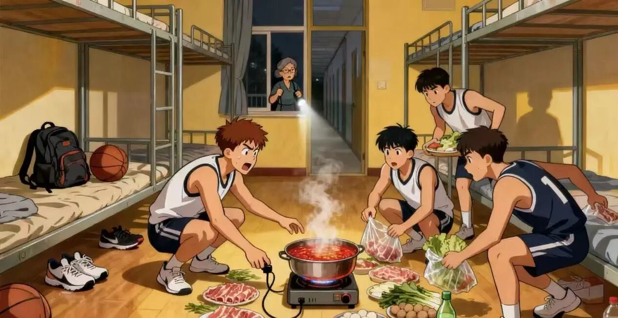 宿舍是大家休息的地方,可不能在宿舍里使用违规电器,像图中在宿舍用违规电器煮火锅就很危险。体育生平时训练后可能会觉得饿,但一定要记住,违规电器功率大,容易引发电路故障,进而导致火灾。所以,想吃东西就去学校食堂或者正规的餐饮场所,别在宿舍里“铤而走险”。