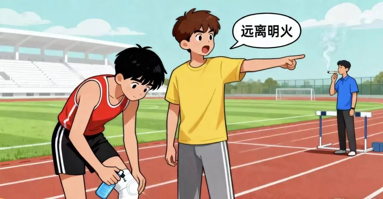 在操场等运动场地,也得注意防火。在图中,看到有人在运动场地附近吸烟,要及时提醒“远离明火”。运动场地周围可能有一些易燃的物品,比如枯草、落叶等,明火很容易引发火灾,而且体育生平时使用的一些运动装备也可能是易燃的,所以在运动场地一定要严格遵守防火规定,不携带明火,看到明火也要及时制止。