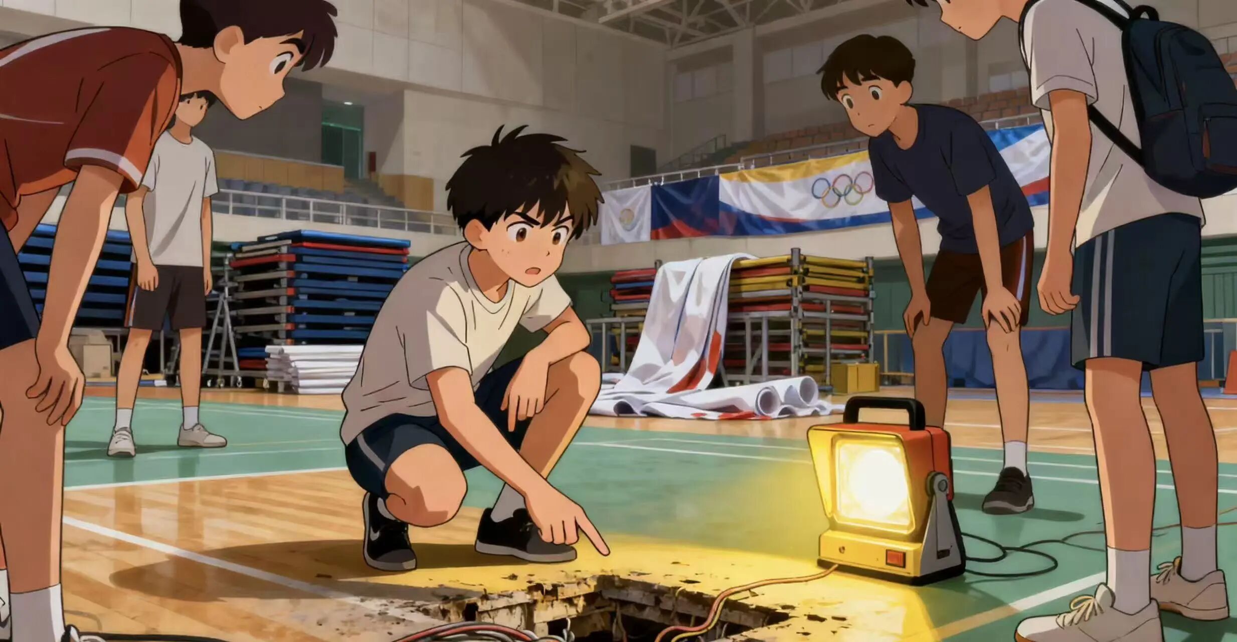 体育场馆是大家训练和活动的重要场所,要定期检查场馆内的设施。如图中,同学们在检查场馆内的设备,看看有没有电路老化、设备损坏等情况。体育场馆里有很多电气设备和运动器材,电路老化或者设备损坏可能会产生电火花等,从而引发火灾。所以,定期对场馆进行防火检查,及时消除隐患,才能保障大家在场馆内的安全。