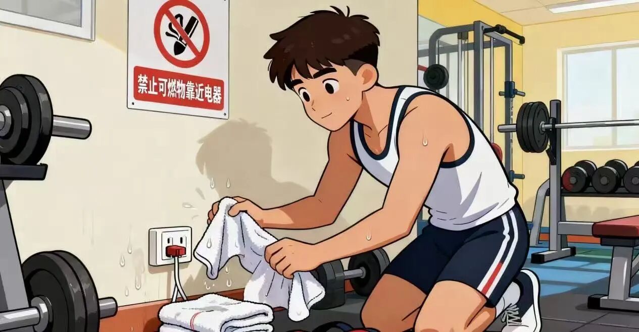 健身房是体育生常去的地方,在健身房里也要注意防火。如图中,健身后擦汗的湿毛巾可不能靠近电器。体育生在健身房运动后会出很多汗,可能会用湿毛巾擦汗,这时候一定要注意,湿毛巾靠近电器,可能会导致电器短路,而且健身房里的一些健身器材也是用电的,一旦发生电气故障,后果不堪设想。所以,在健身房里要时刻注意,不让可燃物靠近电器,保持健身房的用电安全。