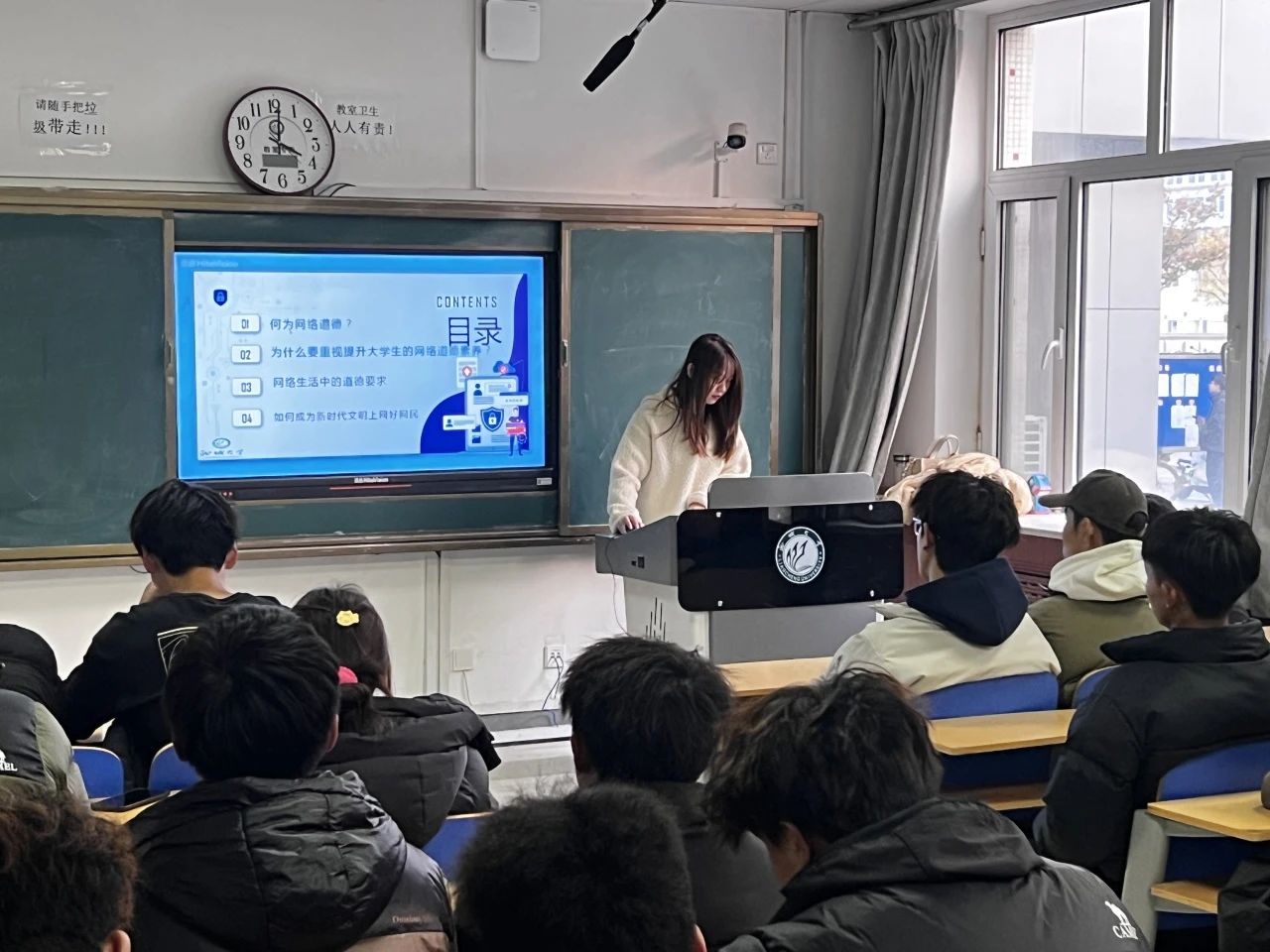 钱晓琪向同学们分享了关于网络道德素养的问题,围绕大学生网络素质提升是网络意识形式安全建设的客观需要,呼吁大学生在网络环境中应提高网络信息的获取和辨别能力、积极引导正确的网络言论风向、健康进行网络交往、强化核心价值素养,以提升网络道德水平。