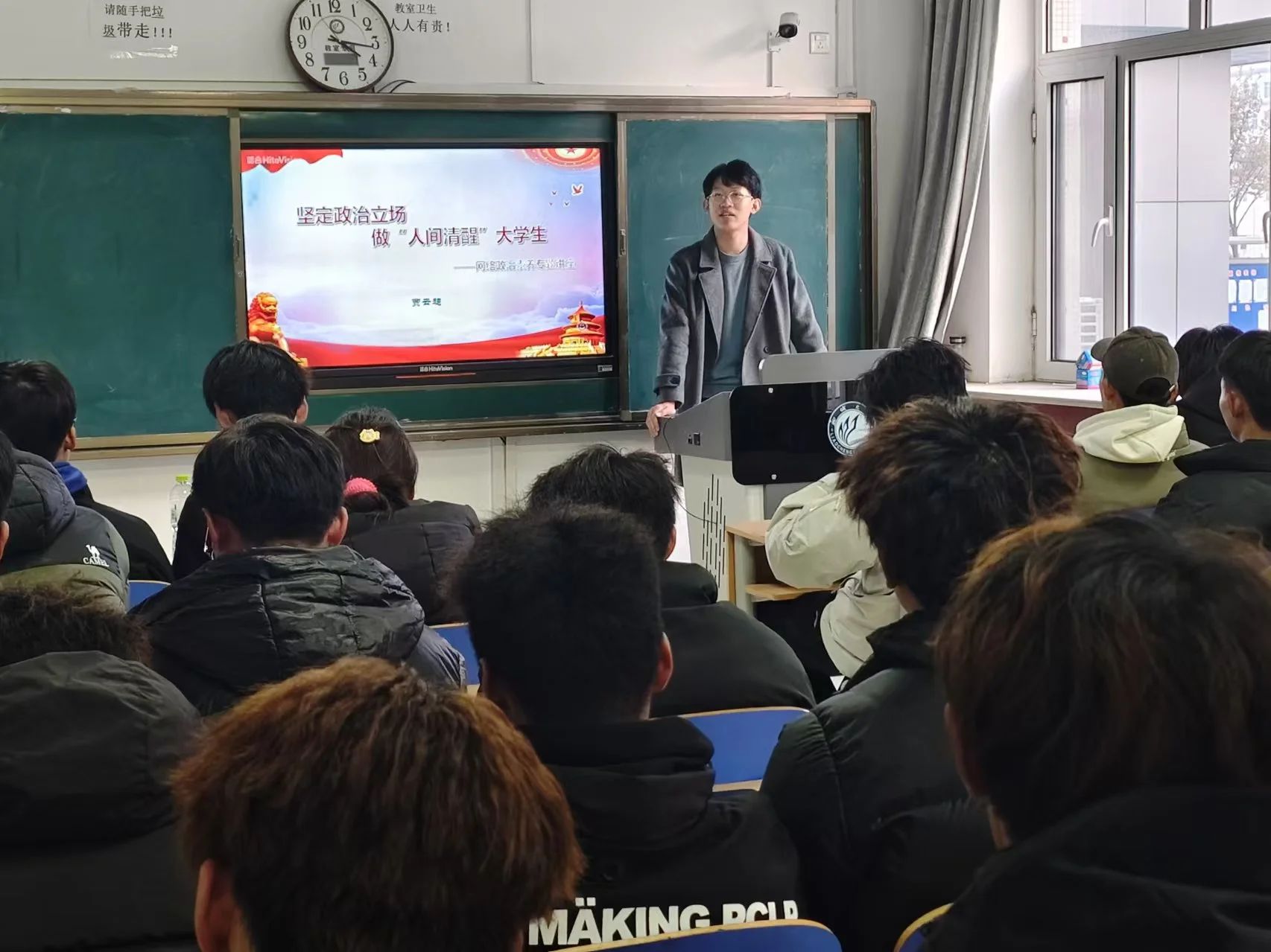 贾云超向同学们阐述了网络政治素养的内涵,提出网络政治素养参与逐渐成为新时代大学生参与政治生活的重要途径,深入剖析了健康的网络政治素养在当代社会中至关重要的作用,并指出了当前大学生在网络素养方面还存在的问题,点明了网络参政的必要性与影响力,呼吁同学们应提升政治领悟力,主动了解政治动态,成为传播新时代正能量传播者。