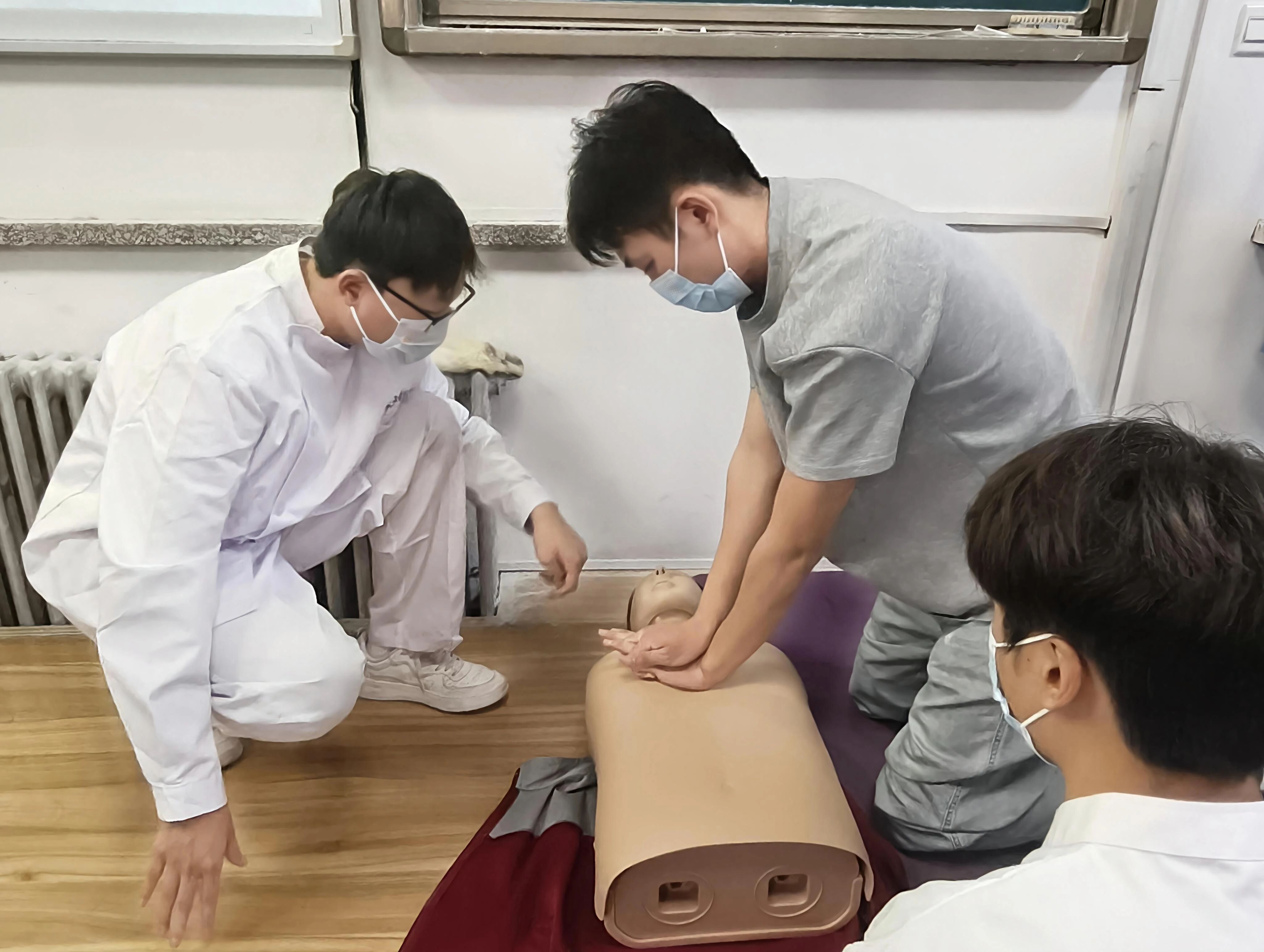 活动里,从心肺复苏的按压深度与频率,到气道异物梗阻的“海姆立克法”,通过主持人专业的讲解,演示者清晰标准的动作,让同学们掌握了急救的方法,让“黄金4分钟”变得清晰可感;同学们在模拟器材前反复练习,从紧张生涩到流畅完成急救流程,在互动里消除了对急救的陌生感。急救技能不是遥远的“知识”,而是守护生命的“底气”。
