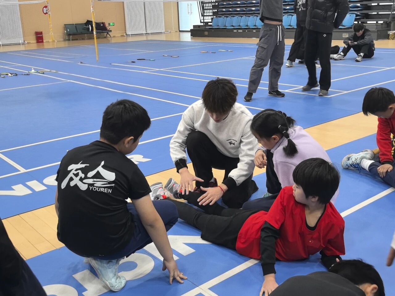 活动伊始,介绍活动主题、目的及核心流程。活动过程中,运动康复专业同学认真细致地讲解科学规范的动态热身方法与具体步骤,带领小运动员们有序开展热身准备;同时科普常见运动损伤的诱发因素,耐心解答运动护具选择、损伤预防及轻微不适处理等疑问。活动尾声,组织实操演示,指导小运动员们相互进行放松练习,重点纠正动作发力模式,确保操作规范。运动康复专业同学以专业实用的知识技能,助力每位热爱运动的参与者有效减少关节损伤,安全享受运动乐趣。