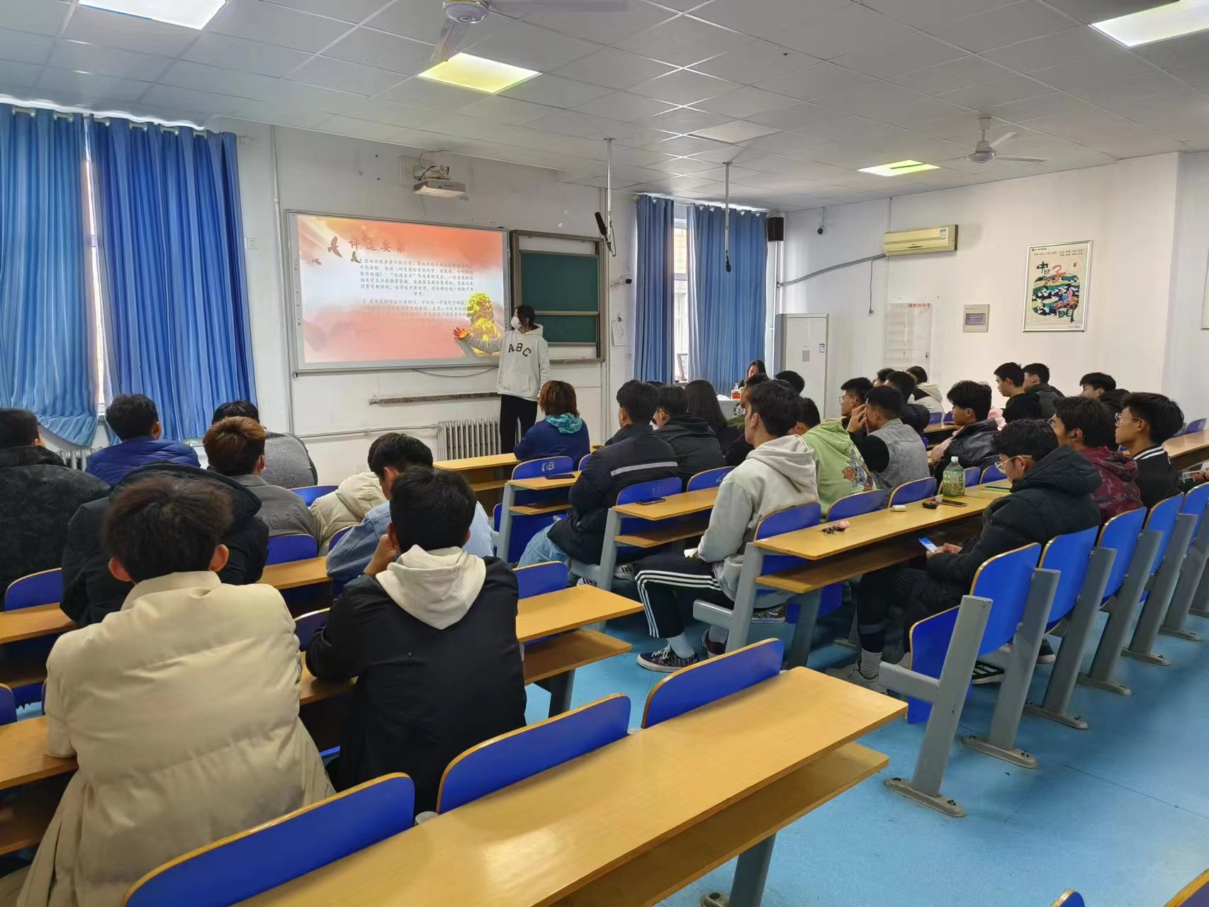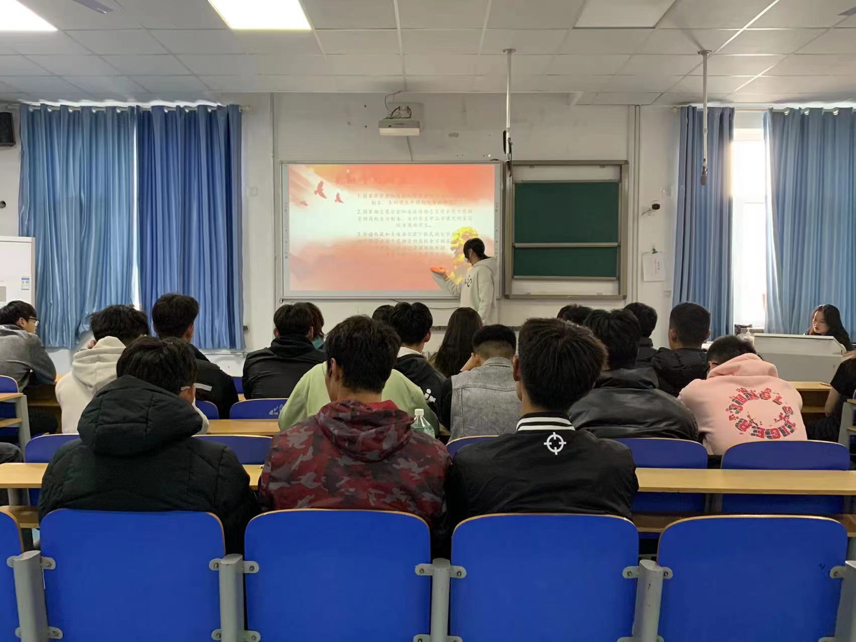 此次活动以讲解PPT和观看视频的形式向同学们宣读国家资助政策体系内容,然后详细向学生解读了高校国家奖学金、国家励志奖学金、国家助学金、校级优秀学生奖学金、国家助学贷款、入伍服义务兵役代偿等资助政策。随后组织同学们进行相互交流,当堂解答学生疑难问题,使国家学生资助政策深入同学们心中。