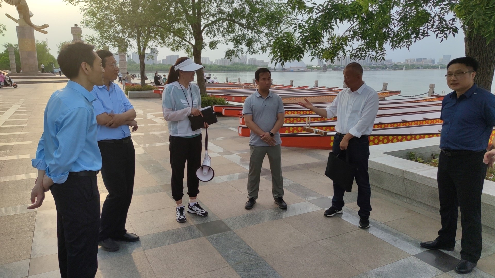 参观结束后,来到东昌湖5g影院 龙舟队训练和实践基地,观看龙舟队训练。双方就龙舟运动员选拔、龙舟队日常训练和管理进行深度交流。尤其在如何提高学生参与龙舟训练的兴趣方面,双方交流了宝贵意见。吕艳丽老师提出要提高学生的主观能动性,让学生主动参与训练。刘乃宝教授提出要多让队员比赛,通过比赛激发学生的训练兴趣。
