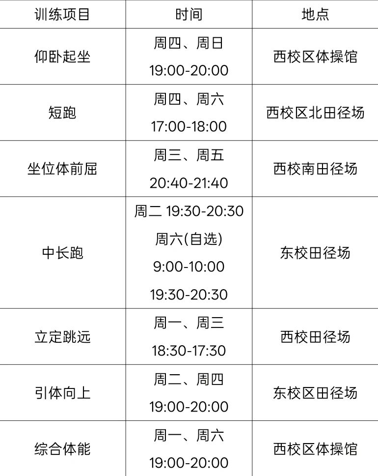 下表为训练项目、时间、地点安排,欢迎同学们随时加入,进行体质提升,告别体测短板!