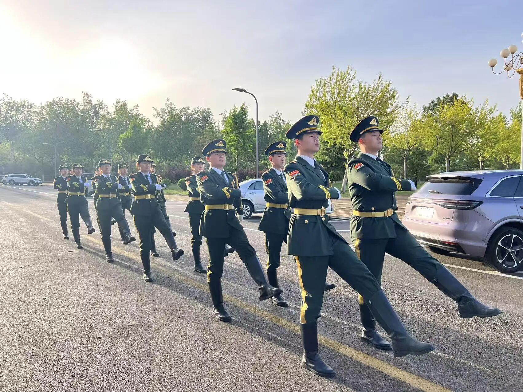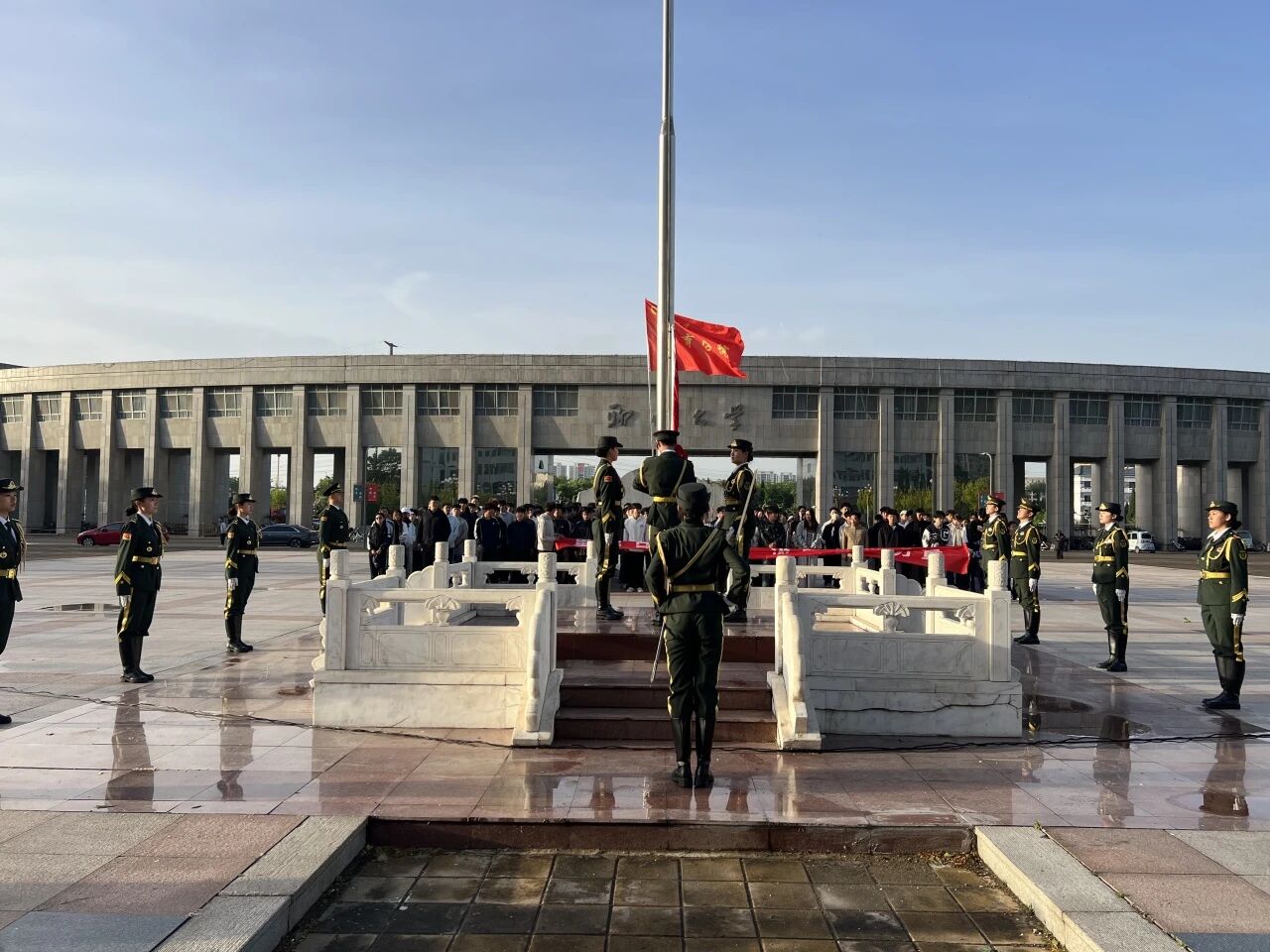 清晨七点,朝阳映照校园。国旗护卫队步伐铿锵,护卫国旗走向升旗台。国歌奏响,五星红旗冉冉升起,全体师生肃立注目,向祖国致以崇高敬意。